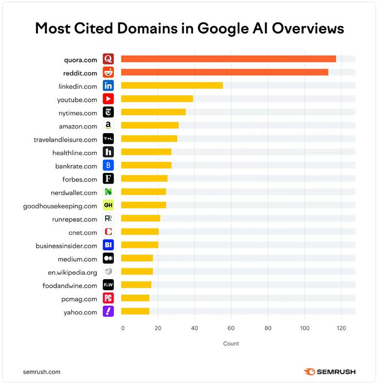 According to Semrush’s AI search study Quora and Reddit are the most commonly cited websites in Google AI Overviews. You can find niche questions being asked and responded by users, that aren’t addressed elsewhere. That makes it’s a rich information source for specific AI prompts. Worth to mention is that back in 2024 Google made arrangement with Reddit to use its answers as training data for Google LLMs.