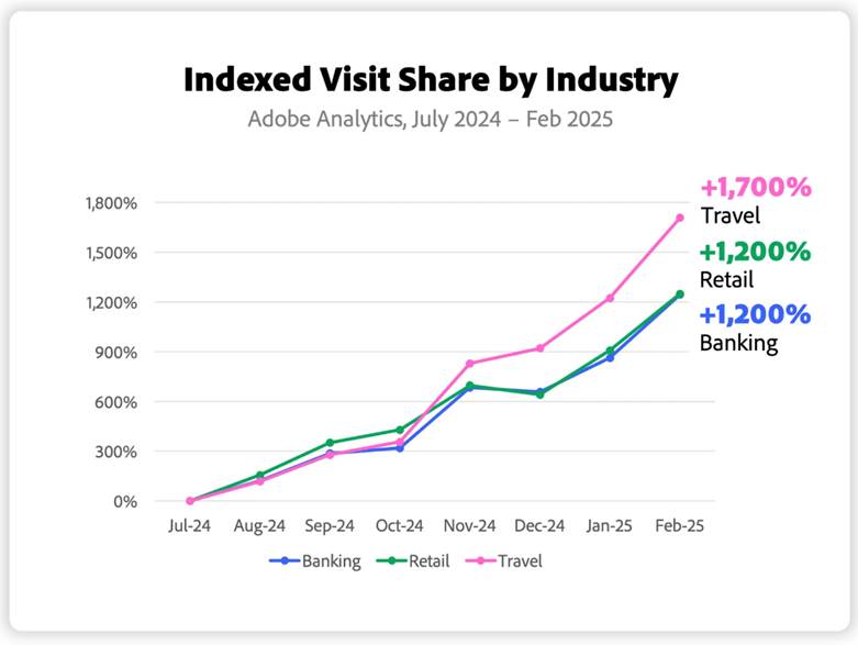 The Adobe research highlights this shift. Between Nov. 1 and Dec. 31 2024, traffic from generative AI sources to U.S. retail sites increased by 1,300% compared to the previous year. The trend has persisted beyond the holiday season. In February 2025, traffic from generative AI sources increased by 1,200% compared to July 2024.